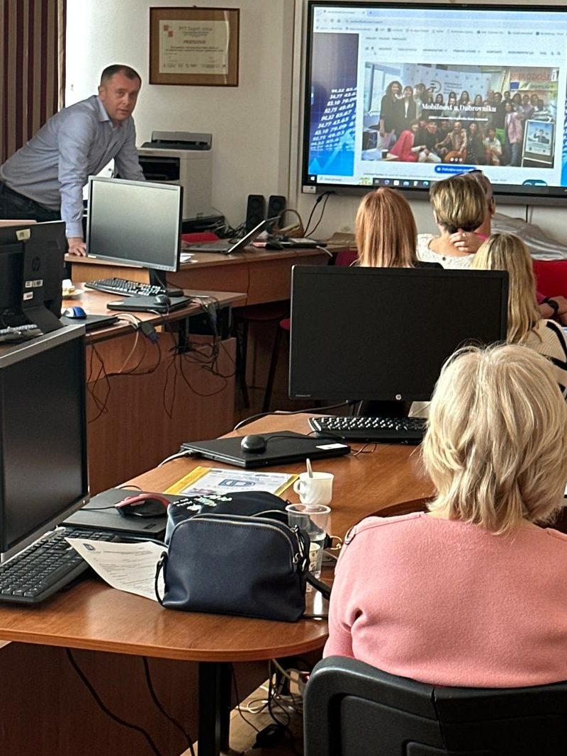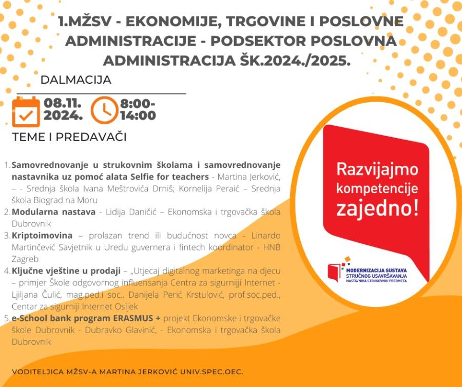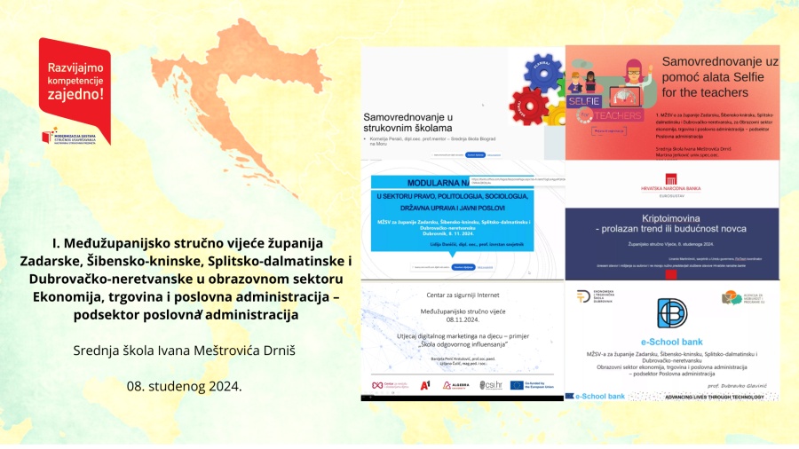 Održano je MŽSV za županije Zadarsku, Šibensko-kninsku, Splitsko-dalmatinsku i Dubrovačko-neretvansku, za Obrazovni sektor ekonomija, trgovina i poslovna administracija – podsektor Poslovna administracija 8.11.2024. na kojemu je između ostalog kolegama iz sektora predstavljen e-School bank program ERASMUS + projekt Ekonomske i trgovačke škole Dubrovnik – voditelj projekta prof. Dubravko Glavinić, dipl. oec. predstavio je sve mogućnosti korištenja programom u nastavi i povezivanja kako učenika tako i srednjih strukovnih škola na razini Republike Hrvatske.
